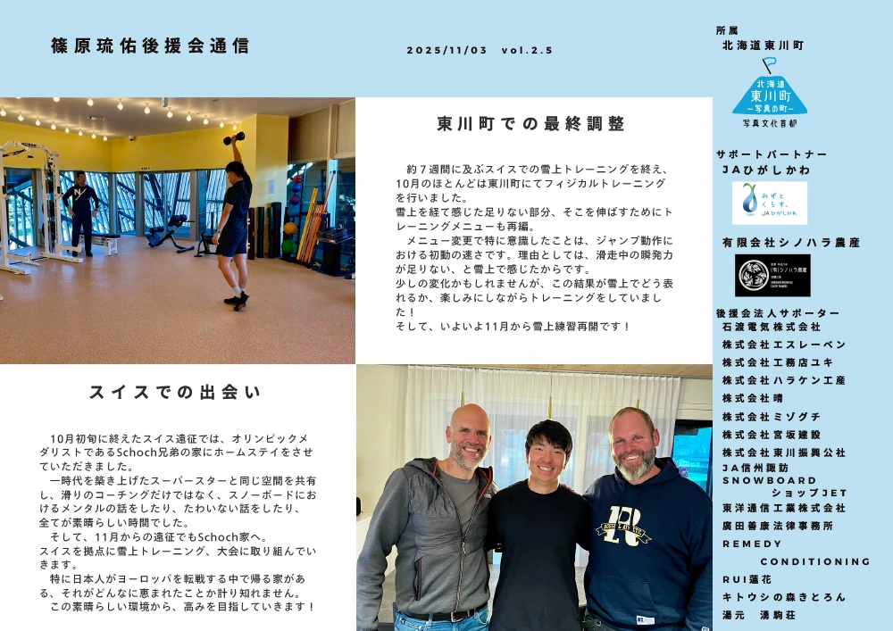 同選手はミラノ・コルティナ2026冬季オリンピック出場を目指し、現在、共⽣プラザそらいろ(東川町東町2丁目12番10号)でトレーニング中です。 8月11日より長期海外遠征に出発されますが、本人お見かけの際は、どうか温かいご声援をお願いいたします。 JAひがしかわは 篠原 琉祐 選手を応援しています。